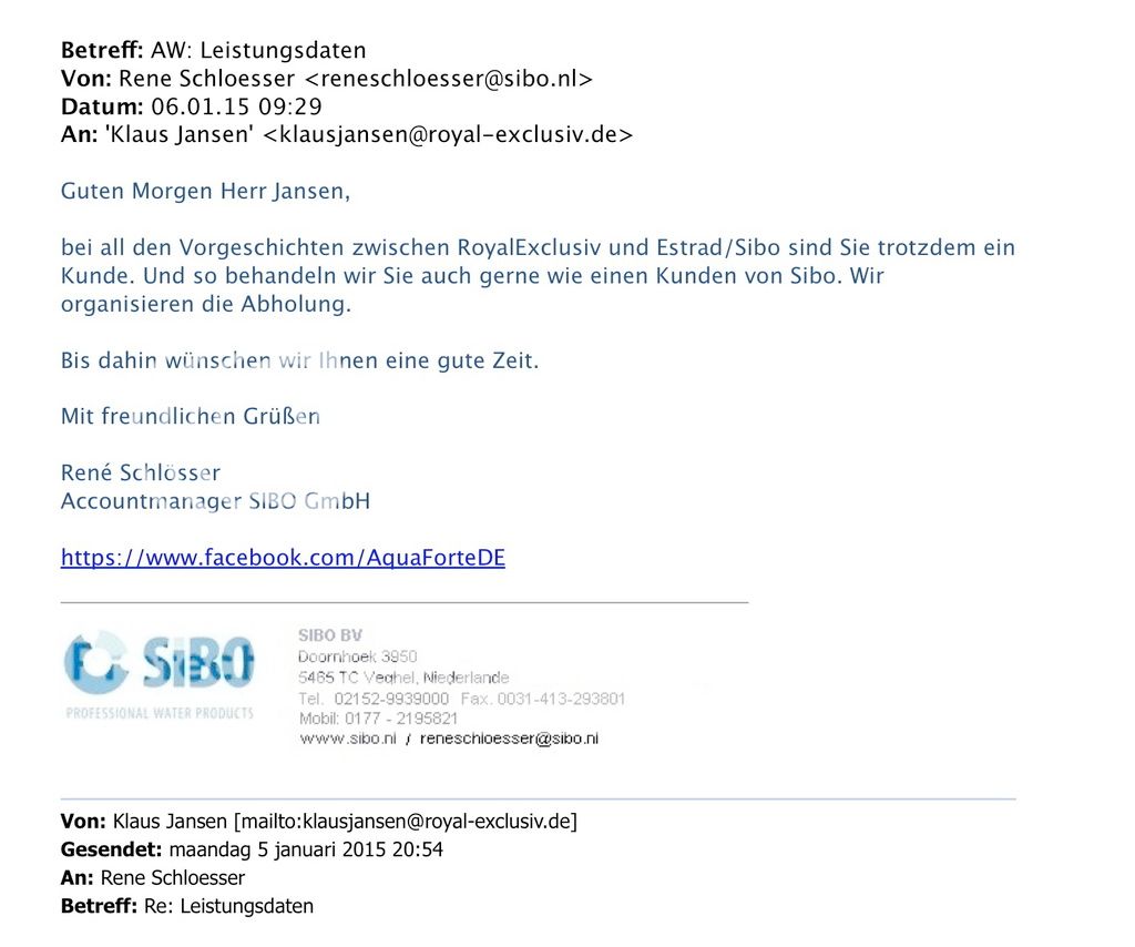 Sibo hat auch nie auf ihre kosten eine Pumpe bei RE abgehohlt. Sibo repariert uberhaupt nicht eine Pumpe denn das macht Estrad BV und da liegt auch wieder nichts vor. Aber er wird wohl die Papiere haben um es zu beweisen. Reparatur incl transport hochstens eine Woche also komm damit oder hor auf Marchen zu erzahlen wobei mann sich nicht verteidigen kann.